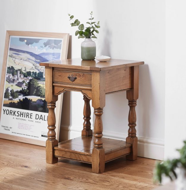 The Clifford Lamp Table is made in solid English Pippy Oak and features a single drawer and potboard.